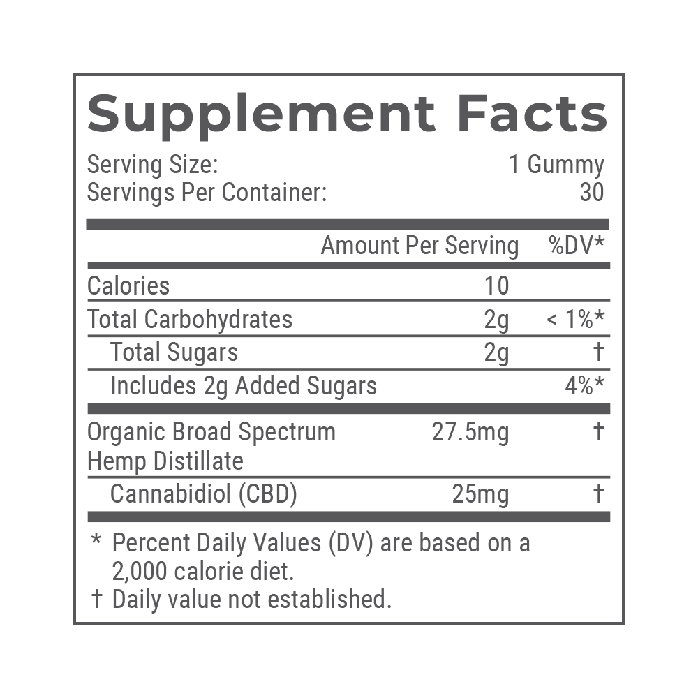 -Stress relief — 25mg of broad-spectrum CBD per gummy